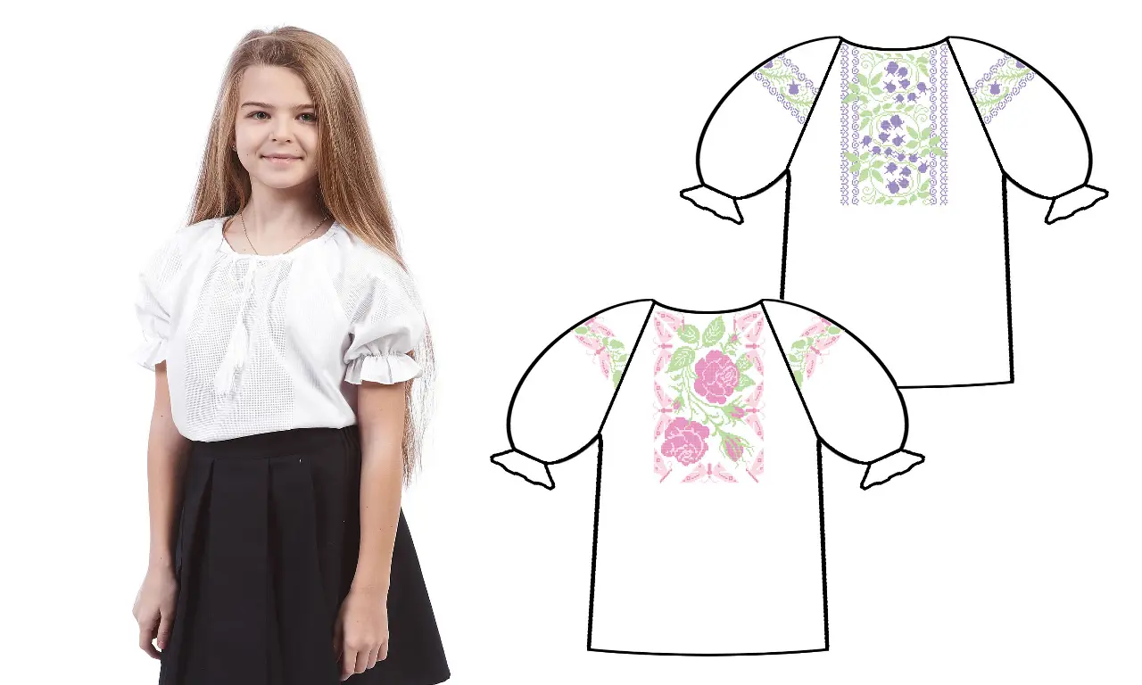 Готова сорочка для дівчаток зі вставками під вишивку хрестиком. Вставки розташовано так, як зображено на малюнку. Сорочка білого кольору з коротким рукавом.