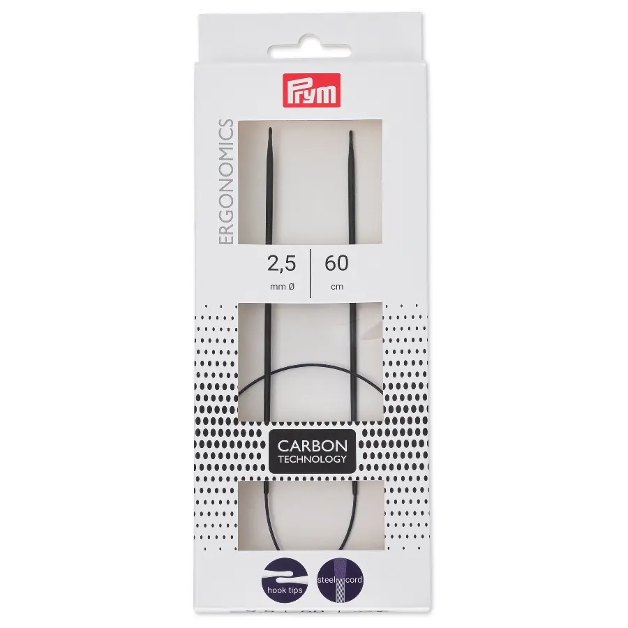 У лінійці карбонових спиць Prym.ergonomics представлені спиці товщиною 2,5 мм. Інноваційне виробництво спиць з полімеру, посиленого вуглецевими волокнами, забезпечує стабільність, гнучкість та легкість навіть за невеликого розміру. Вони захоплюють своєю чорною матовою поверхнею дуже благородного вигляду.