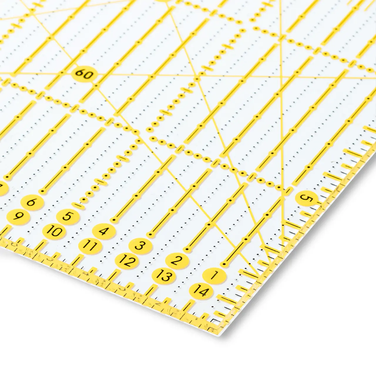 Жовтий/чорний растровий друк на вибір з метричною або дюймовою шкалою дозволяє наносити точні маркування як на темних, так і на світлих тканинах. Стійка до появи подряпин лазерний друк з нижньої сторони лінійки виключає оптичні спотворення. Товстий, зносостійкий матеріал гарантує надійне проведення розкрійних та макетних ножів по підкладці для різання.