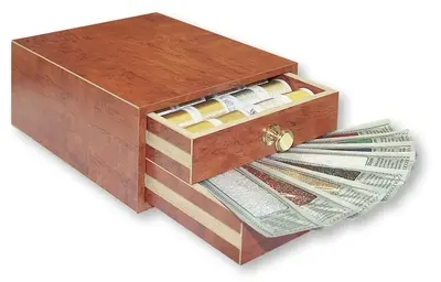 До складу набору входять 44 котушки з металевим ефектом для машинної вишивки: - 20 котушок Metallic №10 по 20м; - 6 котушок Metallic №12 по 40м; - 2 котушки Metallic №20 по 50м; - 4 котушки Metallic №25 по 40м; - 6 котушок Spectra по 100м; - 6 котушок Heavy Metal №30 по 200м. Скринька зроблена з дерева, має дві ніші, що відкриваються. Усередині кожної ніші розташований лист із нумерацією та зображенням кольору нитки. Запропоновані нитки використовуються для декоративної вишивки. Нитки Madeira Metallic мають барвисту колірну палітру та блиск. Підходять для всіх швейних та вишивальних машин.