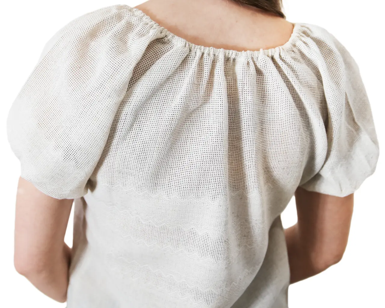 Готова жіноча льняна сорочка зі вставками під вишивку бісером. Вставки розташовано так, як показано на малюнку. Сорочка кольору льон з коротким рукавом.
