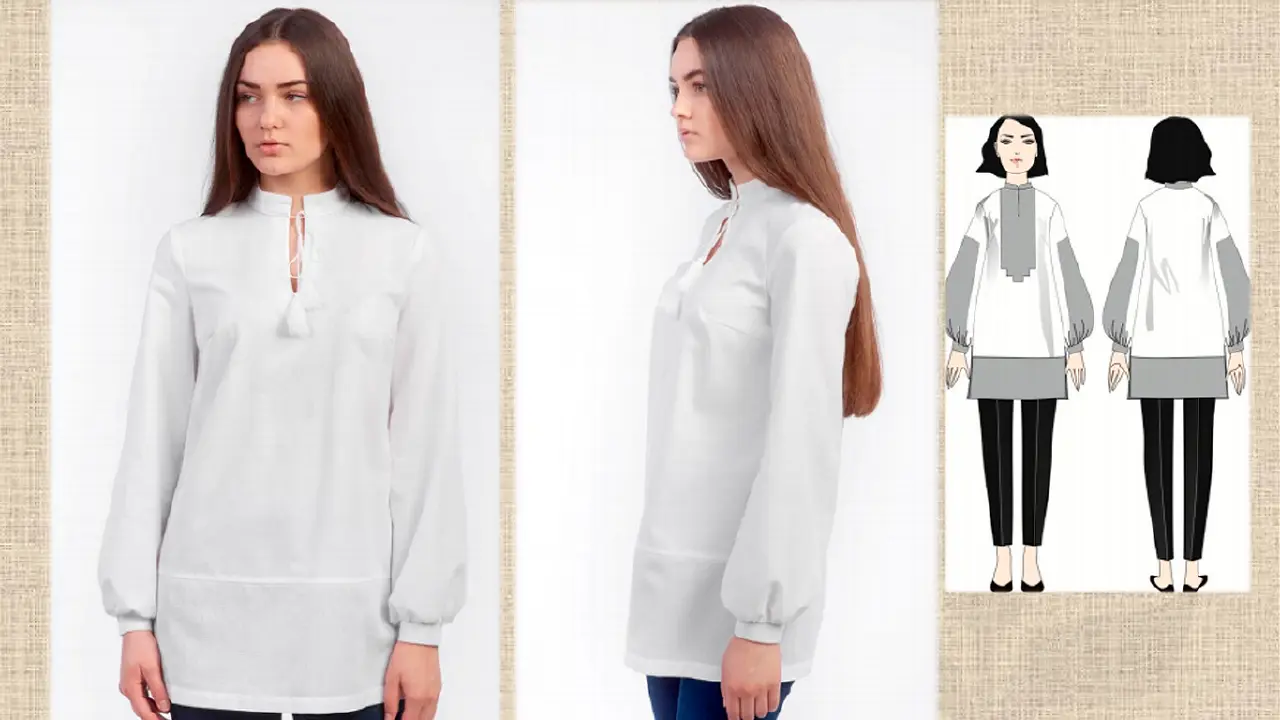Готова жіноча біла сорочка із вставками під вишивку нитками. Вставки розташовані так, як показано на малюнку. Рубашка з довгим рукавом та коміром стійка.