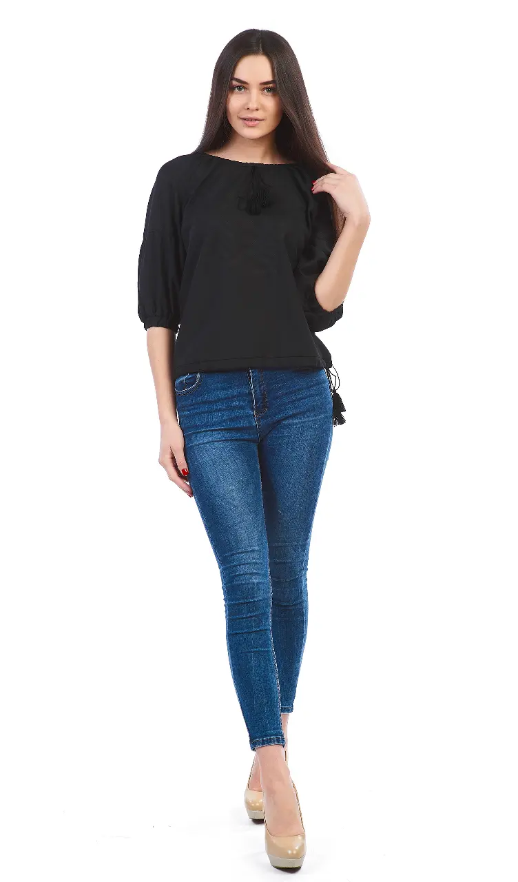 Готова жіноча сорочка зі вставками під вишивку хрестиком. Вставки розташовано так, як зображено на малюнку. Сорочка чорного кольору з рукавом 3/4.
